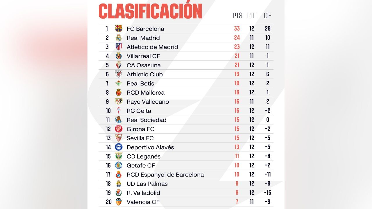 A estas alturas de la jornada 19, casi el ecuador exacto del torneo, la jerarquía parece haberse asentado, aunque con matices que nadie vio venir. No es solo cuestión de puntos. Es la sensación de dominio. El club catalán lidera la clasificación con puño de hierro, sumando 49 puntos tras una primera vuelta casi impecable. Han ganado 16 partidos de 19. Una auténtica locura de efectividad que los mantiene cuatro puntos por encima de su perseguidor más mediático.