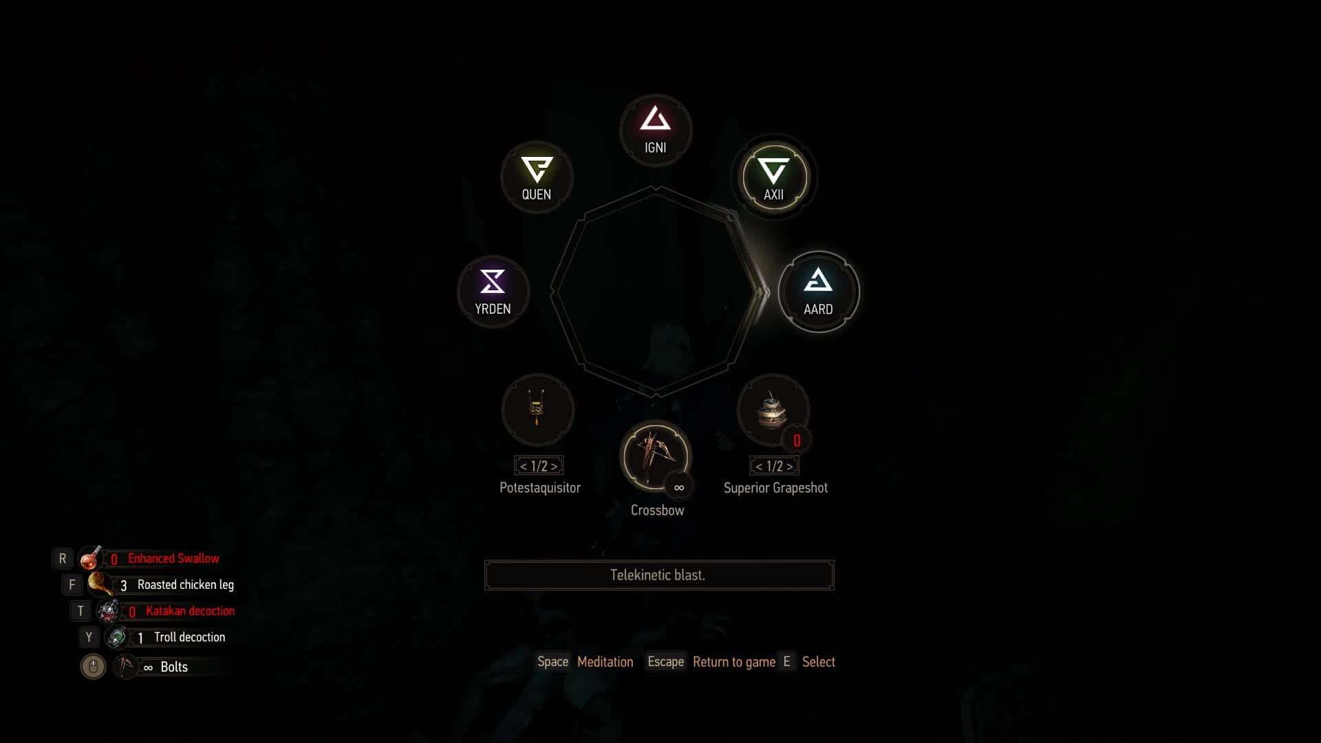 - Whirl: Essential. It turns Geralt into a blender.