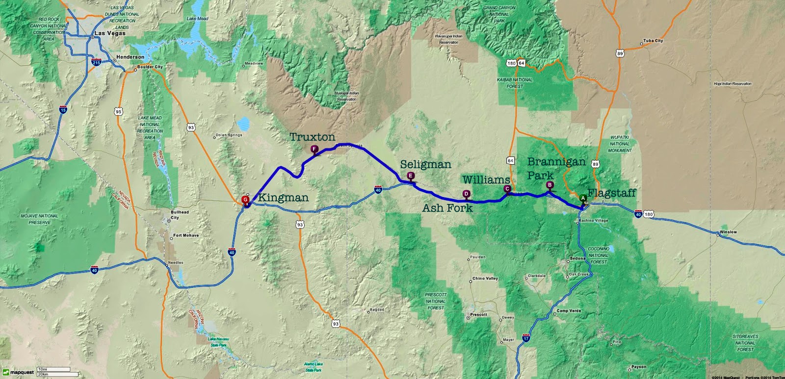 - Fuel: Gas up in Flagstaff or Williams. Prices in Seligman and the smaller stops on the 66 loop are significantly higher.