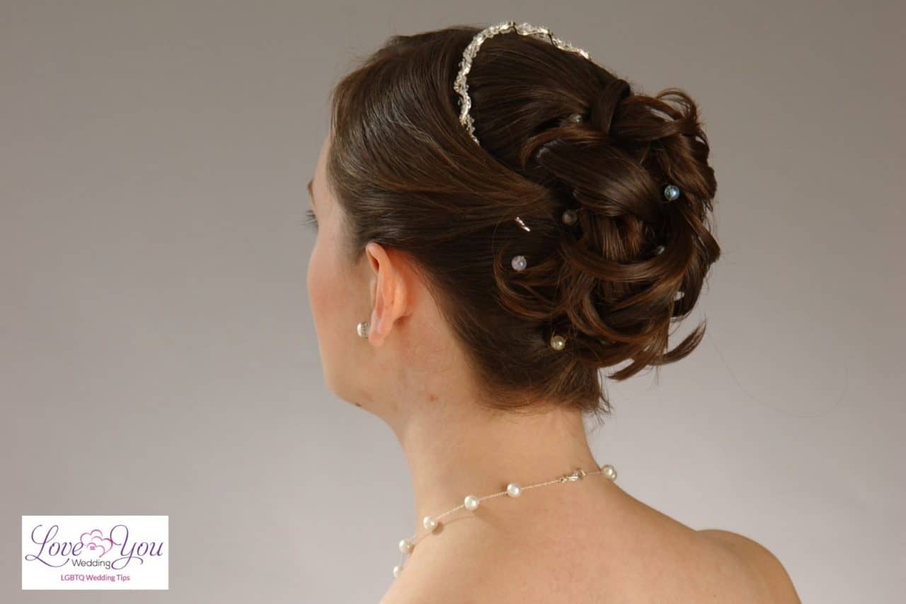 And the veil? If you’re wearing an updo, the veil should almost always come out from the top of the bun or just underneath it. Placing it on top of the head behind the tiara can work, but it creates a very 1980s silhouette. Unless you’re going for a vintage retro look, keep the veil lower.