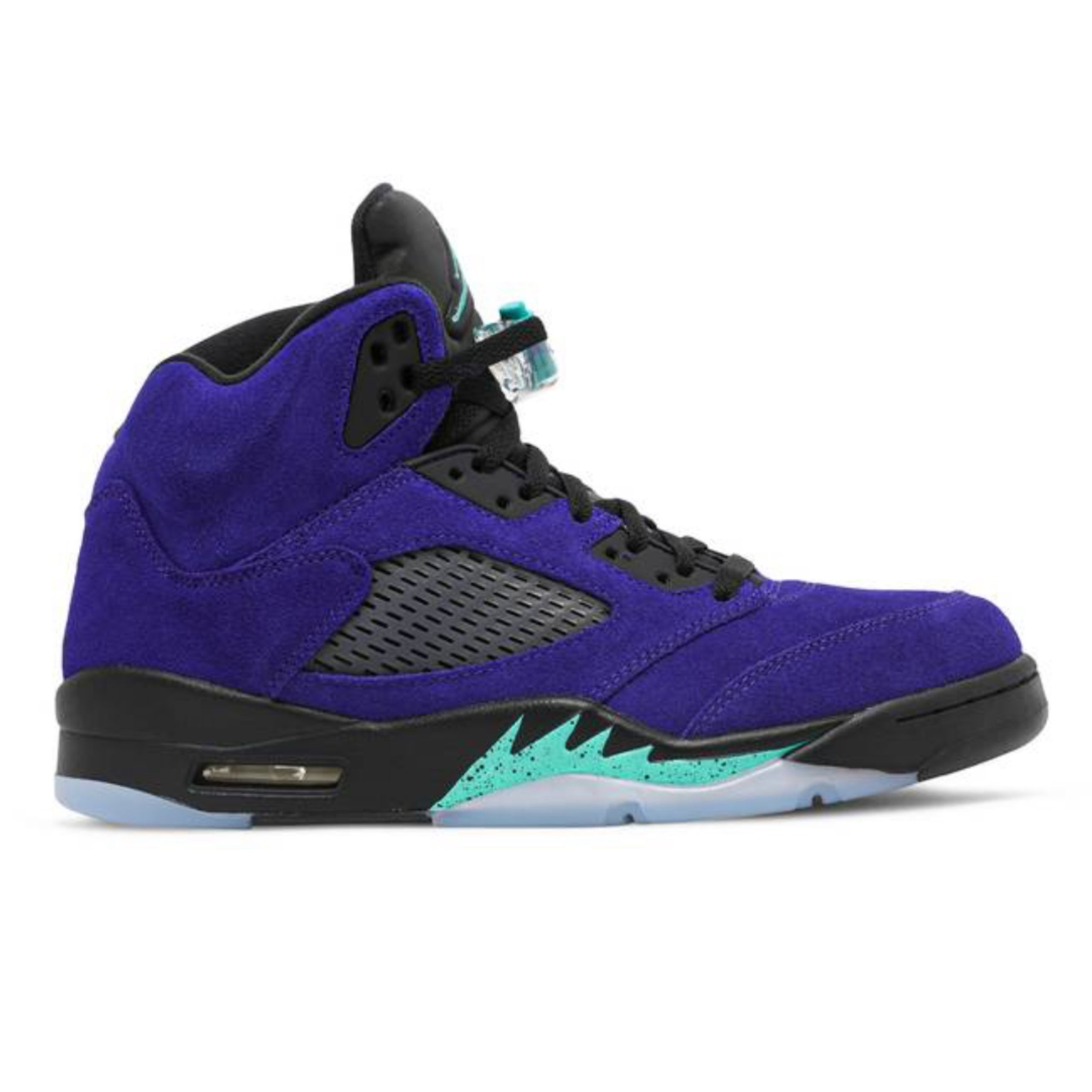 The Jordan 5 Alternate Grapes, officially colored as Grape Ice/Black/Clear/New Emerald, decided to ditch leather entirely. They went with a lush, hairy suede. It’s soft. If you run your finger across it, the grain shifts. That choice changed the entire vibe of the silhouette.