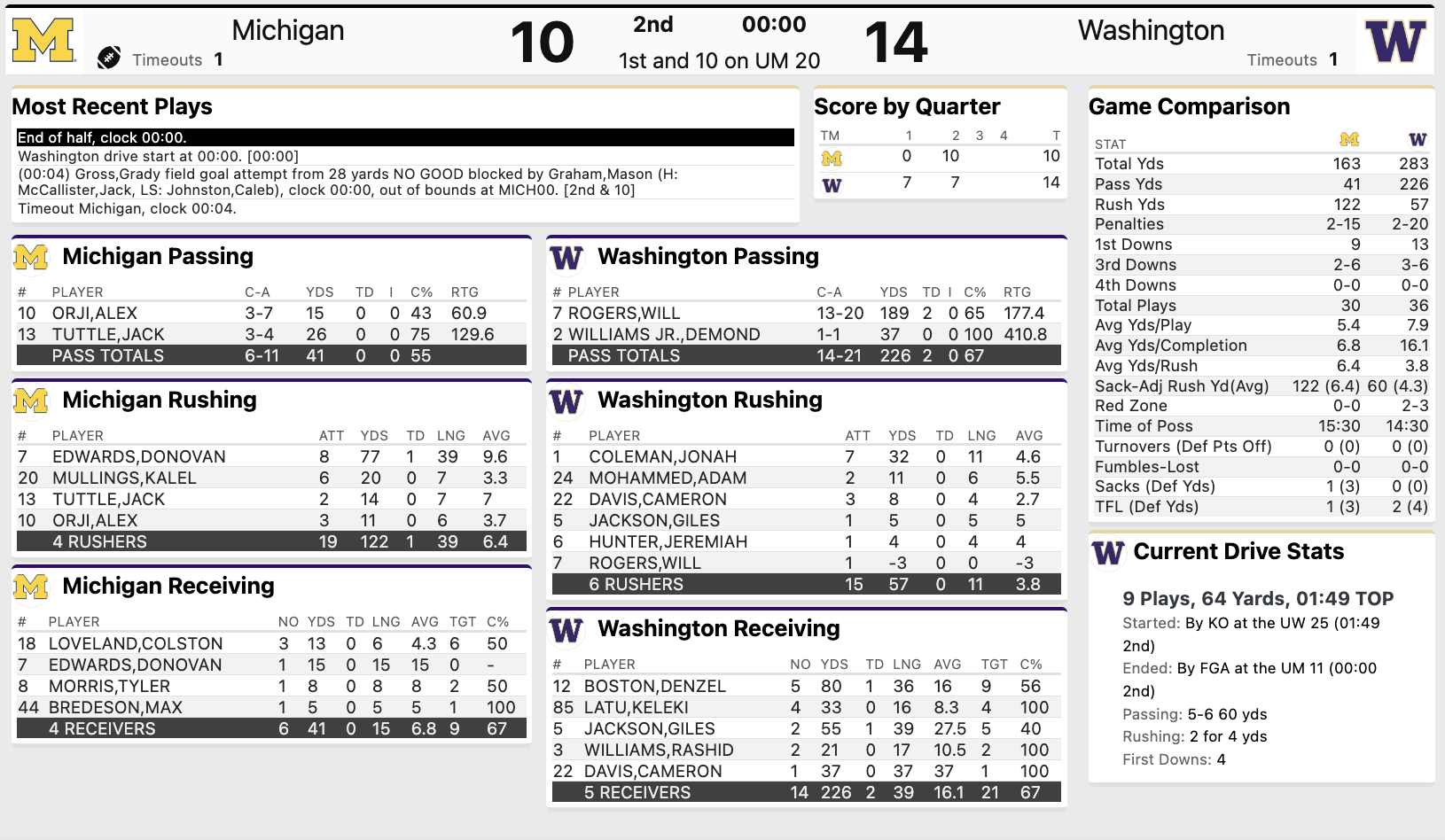 - The Turnover Gap: In both games, the team that won the turnover battle won the game. Michigan was +2 in January; Washington was +1 in October.