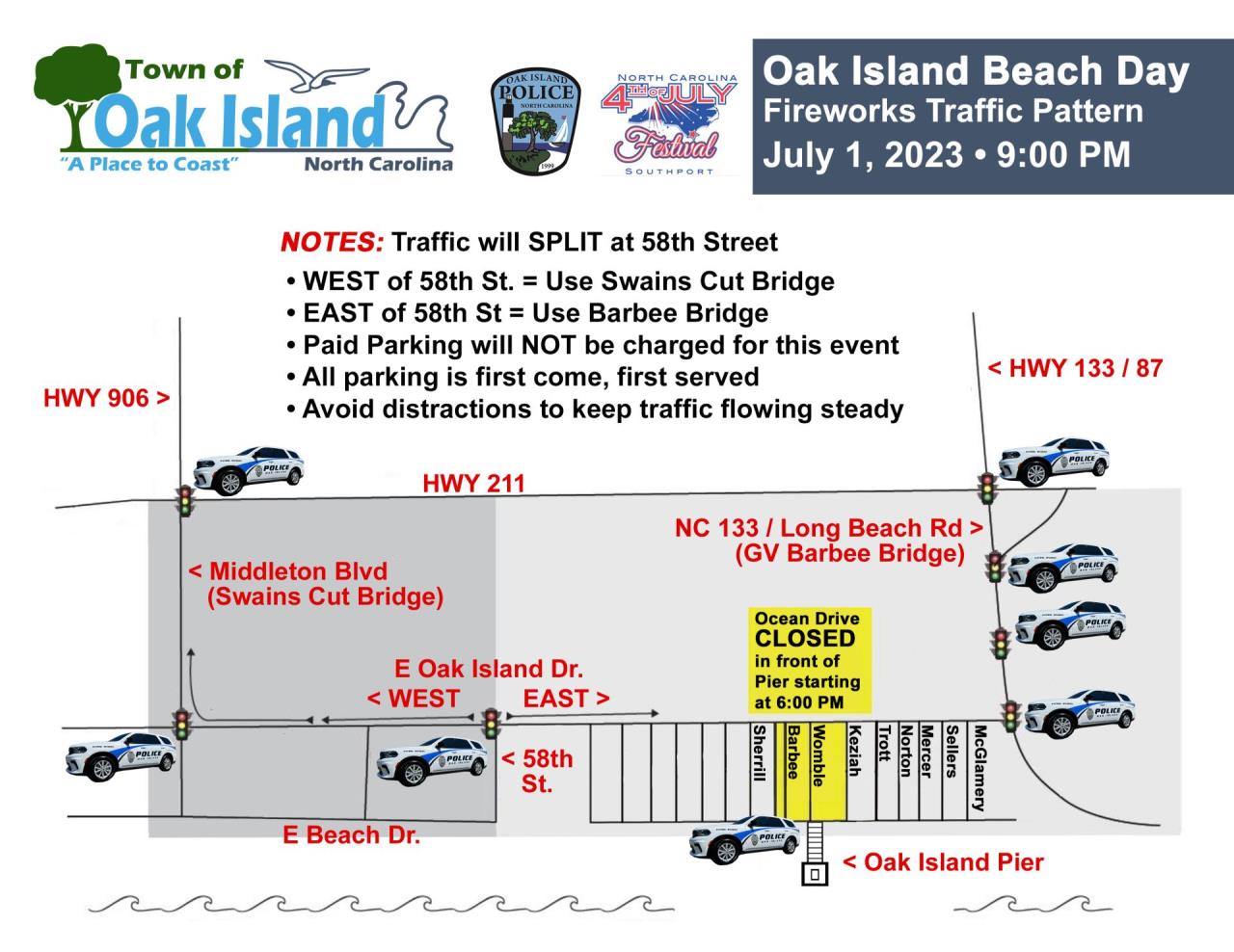 The pyrotechnics launch from the Oak Island Pier. This is a crucial detail. Since the pier sticks out into the Atlantic, you get this incredible reflection off the water that makes the show feel twice as big as it actually is. If you're sitting too far down toward the west end, near the 801 Ocean Event Center, you'll see them, but you won't feel them. You want to be between 15th Street East and 15th Street West for the "premium" experience.
