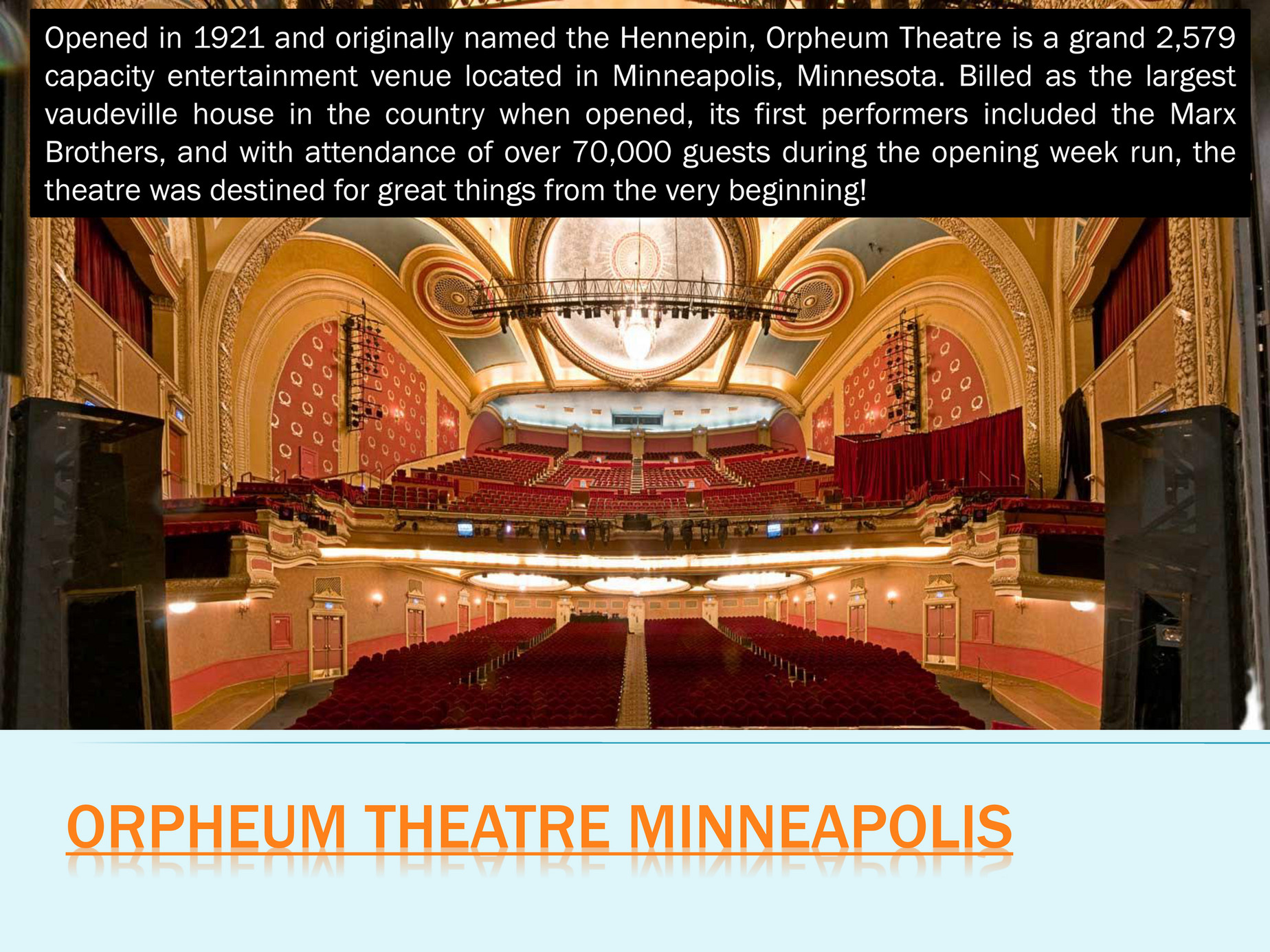 When it opened in 1921 (it was called the Hennepin back then), the Orpheum was the largest vaudeville house in the country. 2,579 seats. That’s a lot of people watching the Marx Brothers. In fact, more than 70,000 guests poured through the doors in just the first week.