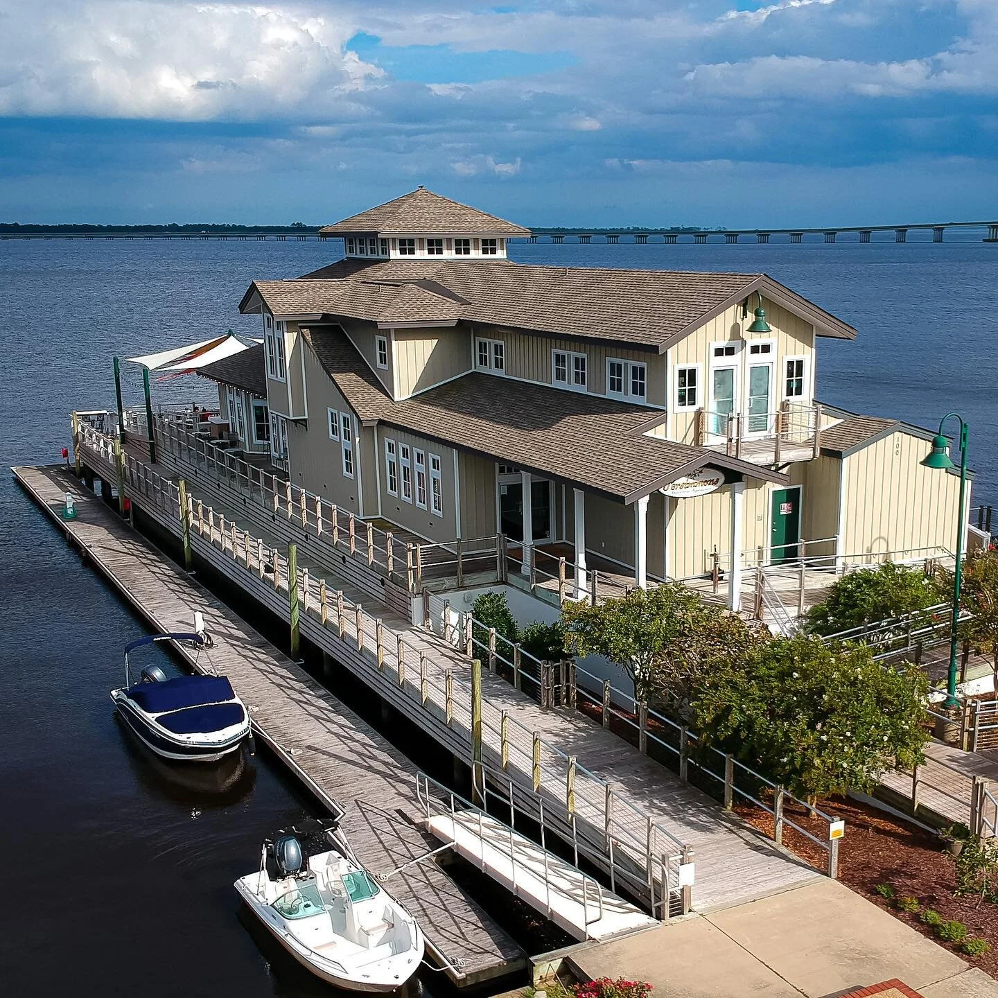 One thing most locals know—but tourists don't—is that the sun sets behind the building, not over the water. You don't get the "sun sinking into the waves" vibe, but you do get that incredible "Golden Hour" glow reflecting off the river and the boats at the Galley Stores Marina next door. It’s arguably better. You aren't squinting into the sun while trying to cut your steak.