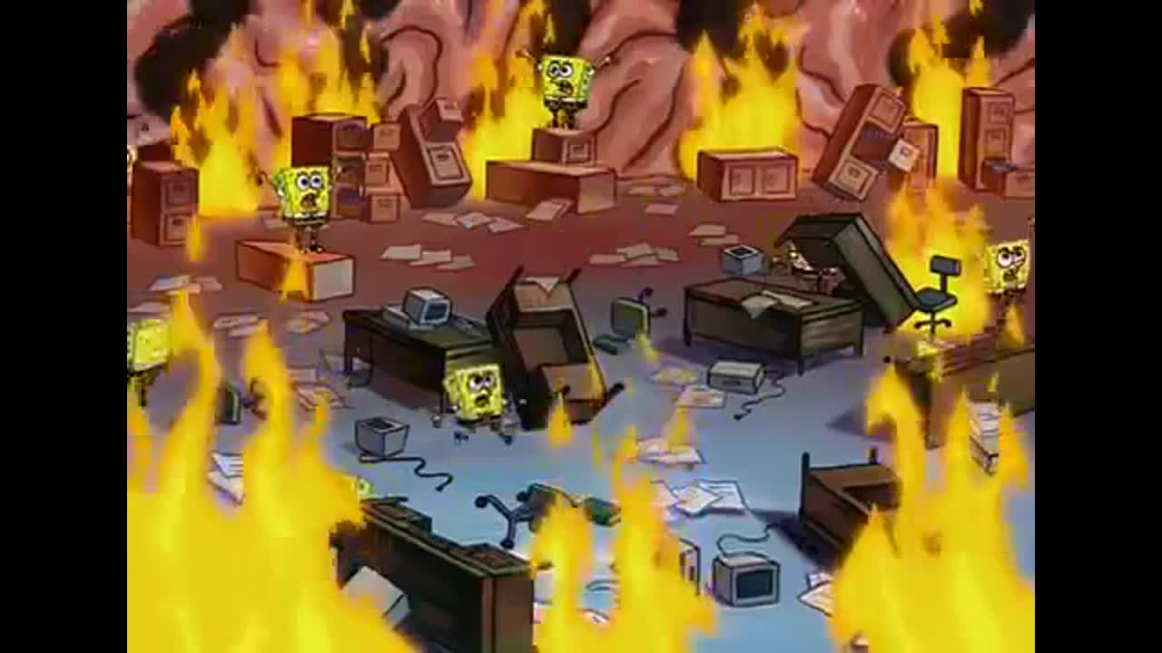 Think back to the episode "Nasty Patty." The atmosphere is dark. There’s rain, there’s a fake crime, and there’s a sense of impending doom. While there isn't a literal fire in every scene, the energy is exactly what the meme represents. We love seeing SpongeBob in high-stress situations because he is the personification of toxic positivity. When he finally breaks, or when he simply stops caring while the kitchen burns, it feels incredibly relatable.