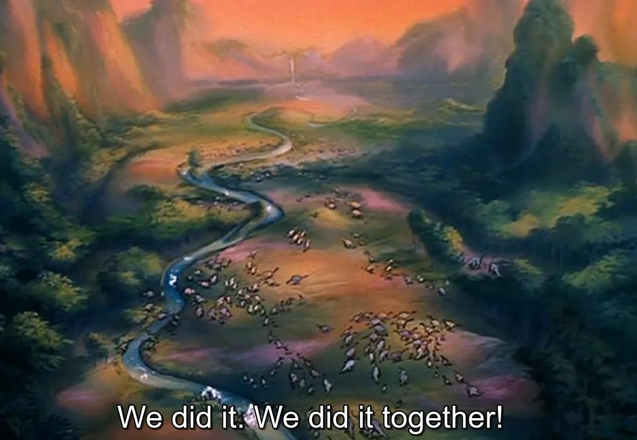 Also, the TV series was airing around the same time. The Land Before Time television show (which ran for one season on Cartoon Network) used a lot of the same assets and tone as the thirteenth movie. In many ways, The Wisdom of Friends feels like a multi-part episode of the TV show rather than a standalone cinematic event.