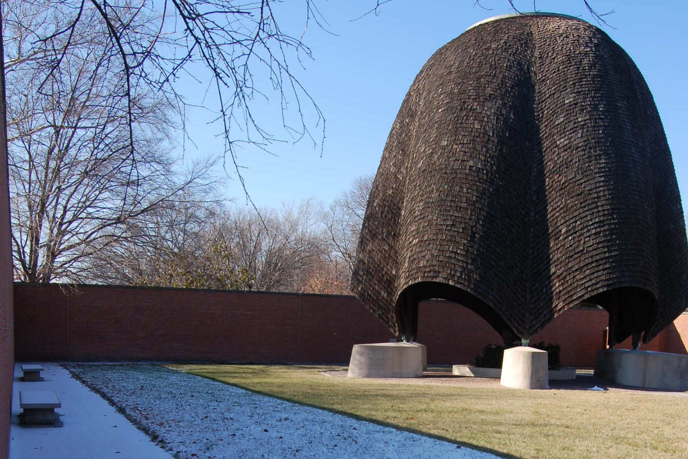 The result was a walled garden that isn't really a garden, and a church that isn't really a building. It's a rectangular space enclosed by high brick walls. Inside, there’s a giant, shingled structure that looks like an inverted tulip or perhaps a futuristic spaceship, depending on how much coffee you’ve had. Underneath that "baldacchino" sits a sculpture by Jacques Lipchitz called Descent of the Holy Spirit.