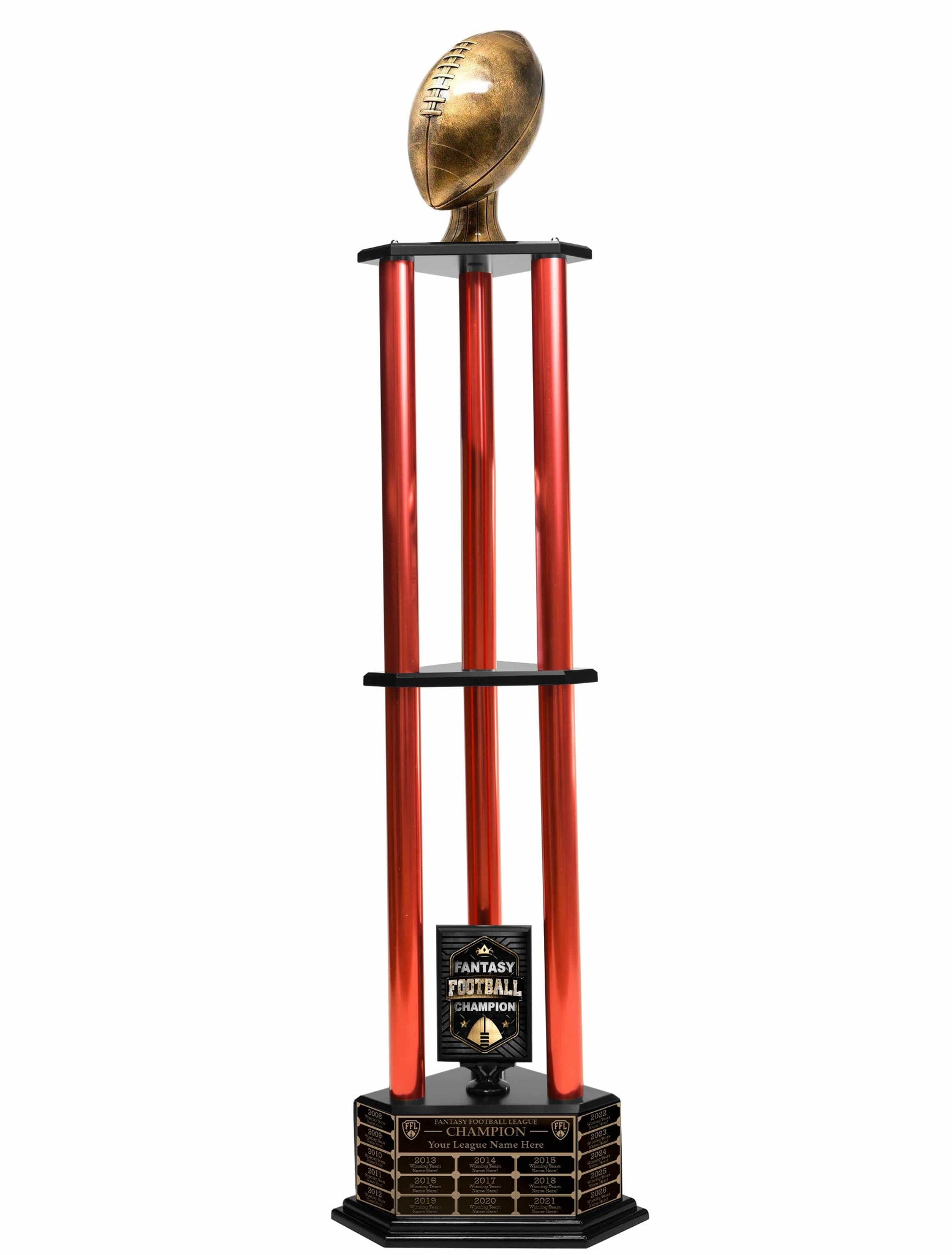 - The "V" base: The triangular pedestal is meant to represent the kick-off or the ball on a tee, but it’s also just a practical way to give the ball height so everyone in the stadium can see it.