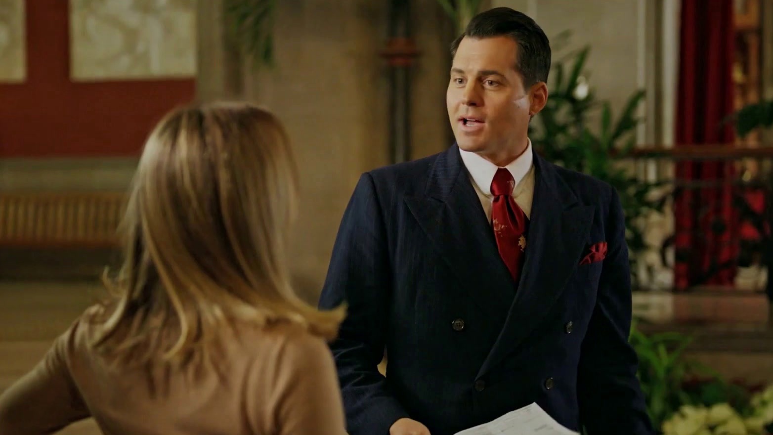Bethany Joy Lenz plays Lucy, a screenwriter who is struggling to get the script right for a remake of a (fictional) 1947 classic called His Merry Wife! She’s sent to the Biltmore to do research. Lenz brings a level of neurotic brilliance to the role. She isn't just a damsel in a scarf; she’s a professional trying to protect the integrity of a story.