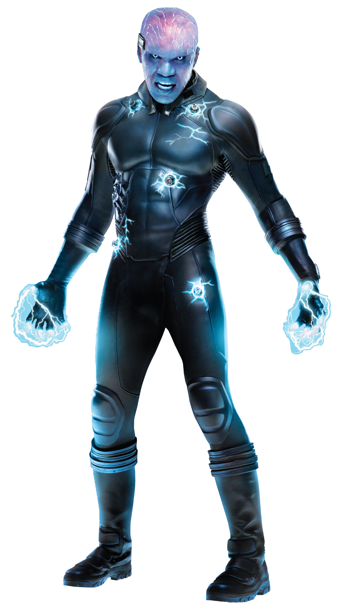 Fans were divided. Some loved the "Ultimate Spider-Man" comic inspiration, where Electro is also a being of pure energy. Others missed the star-shaped mask. You've probably seen the memes about him looking like a Dr. Manhattan knockoff. Kinda fair, honestly. But the blue design served a narrative purpose: it made him look cold. Inhuman. By the time he teams up with Harry Osborn, the "human" parts of Max are basically gone. He’s just a weapon.