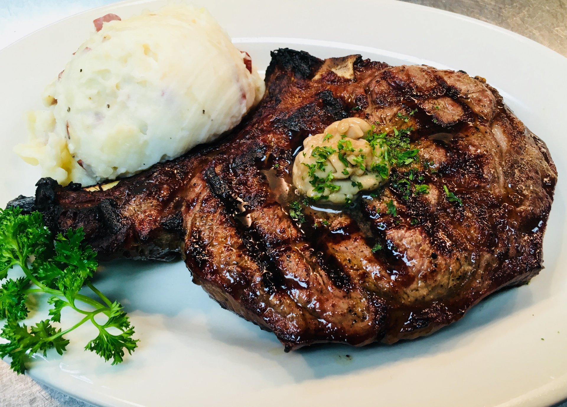 The Prime Rib is the undisputed heavyweight champion here. They do it the right way—slow-roasted, seasoned heavily on the outside, and served with au jus that isn't just salty water. If you go on a Saturday night and don’t see a Prime Rib on every third table, you’re probably in the wrong restaurant. They offer different cuts, of course. The Queen cut is plenty for most mortals, but the King cut is... well, it’s a commitment.