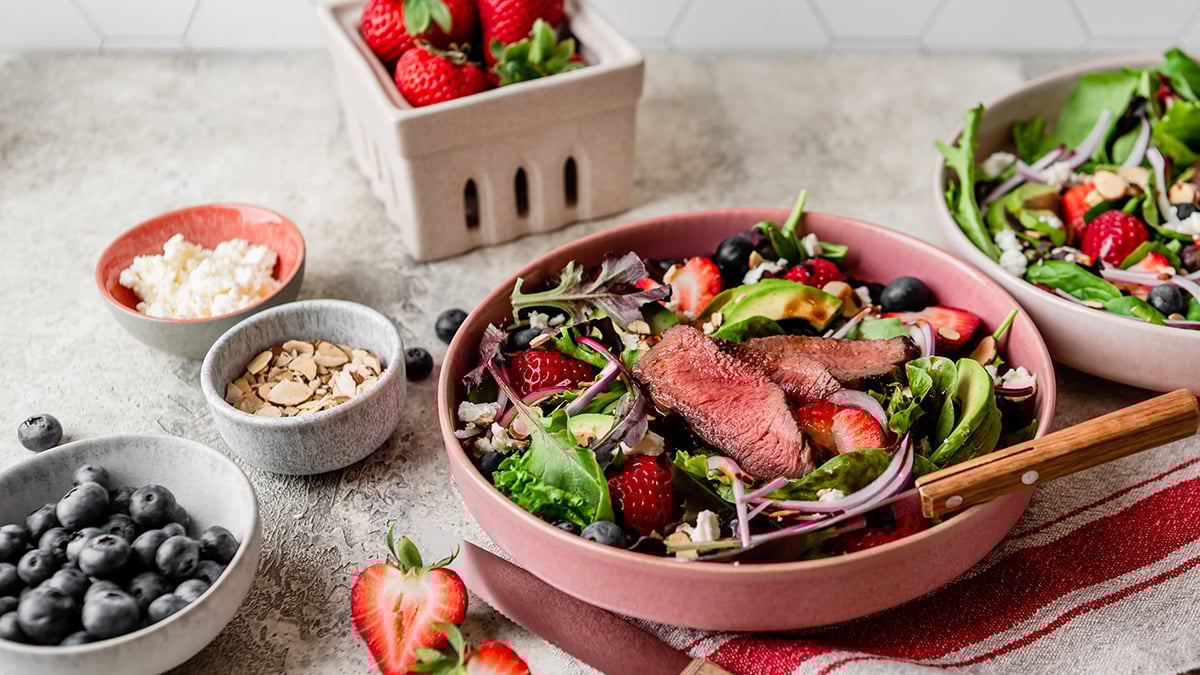 The strawberries bring a massive hit of Vitamin C. Interestingly, Vitamin C actually helps your body absorb that iron from the steak even better. It’s a synergistic relationship. You’re also getting fiber from the greens and healthy fats if you throw some toasted pecans or walnuts on top. It’s a "real food" meal that doesn't leave you feeling like you need a nap at 2:00 PM.