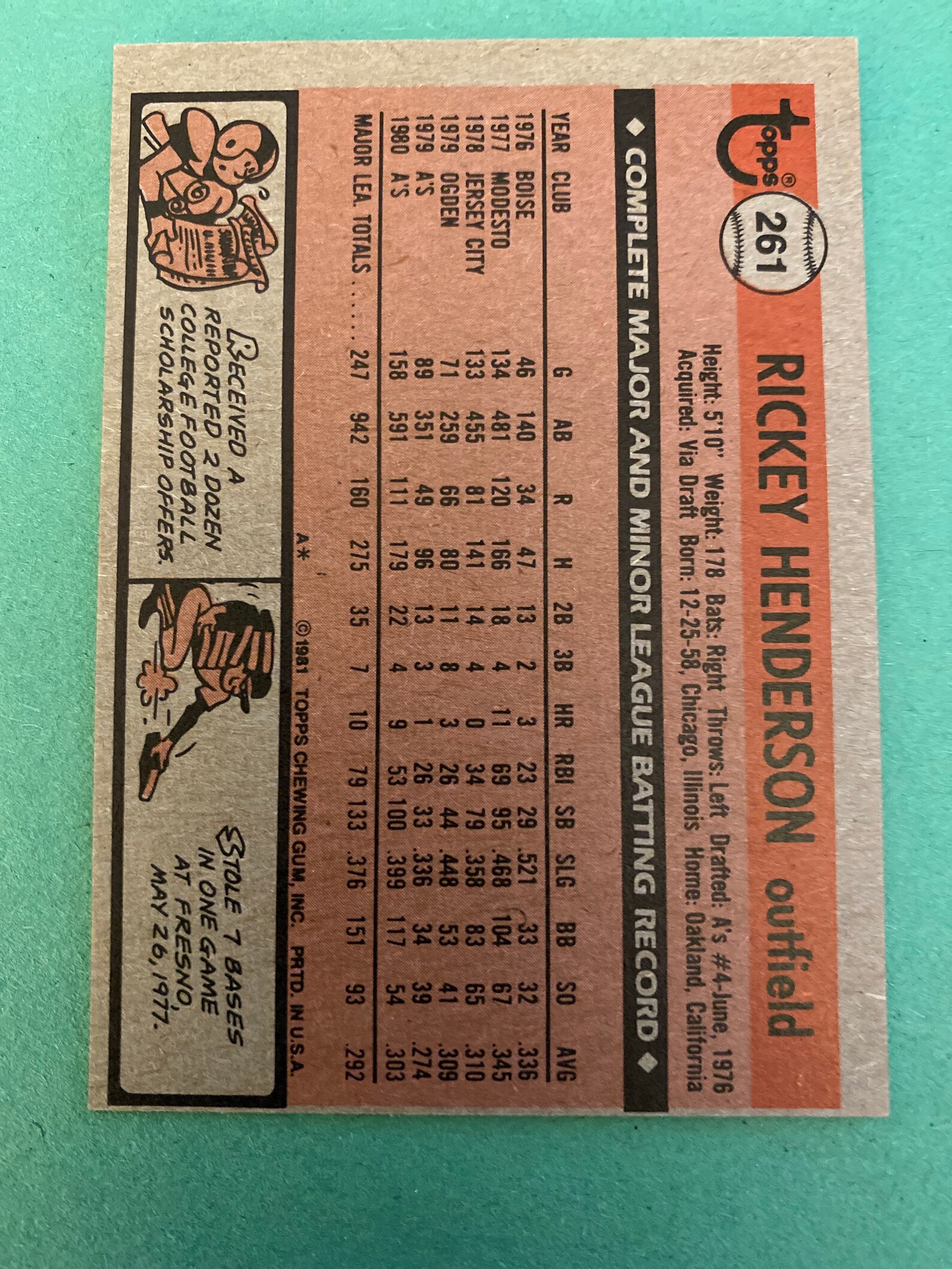 The 1981 Topps set is notoriously difficult. It’s a mess of print defects, "snow" (those tiny white print dots), and centering that looks like it was cut by someone wearing a blindfold. When you look at Rickey’s #361 card from this set, you’re seeing a masterpiece of early 80s design, even if the quality control was a nightmare. He’s there in his yellow-and-green Oakland A’s jersey, looking ready to teleport to second base before the catcher even stands up.