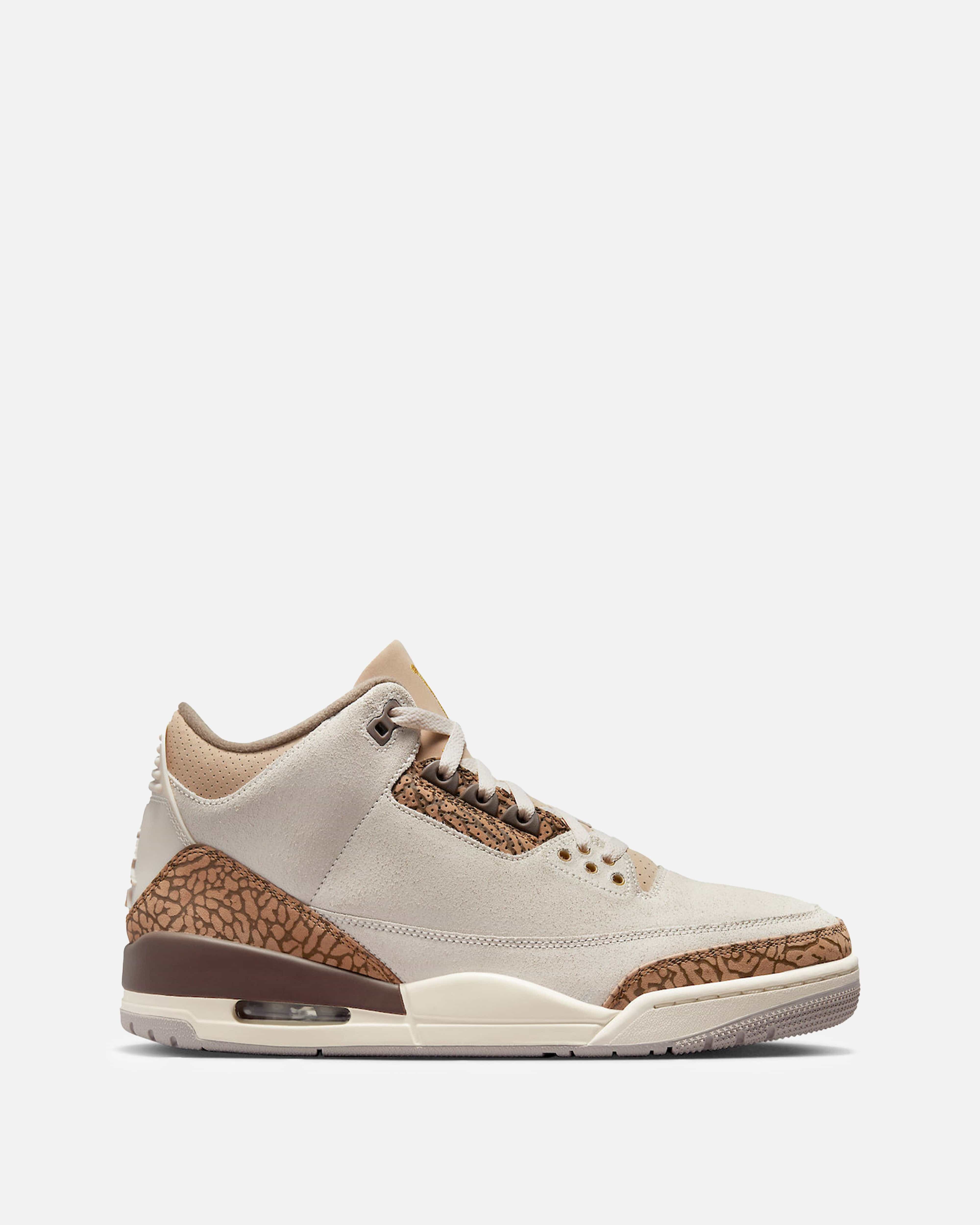Most Threes rely on that classic tumbled leather. It’s iconic, sure. But the Air Jordan 3 Retro Palomino flips the script by leaning heavily into buttery light orewood brown suede. It feels different. When you run your thumb across the upper, there’s a tactile response you just don’t get with the standard leather drops. It gives the shoe a "heritage" vibe without needing to literally be forty years old.