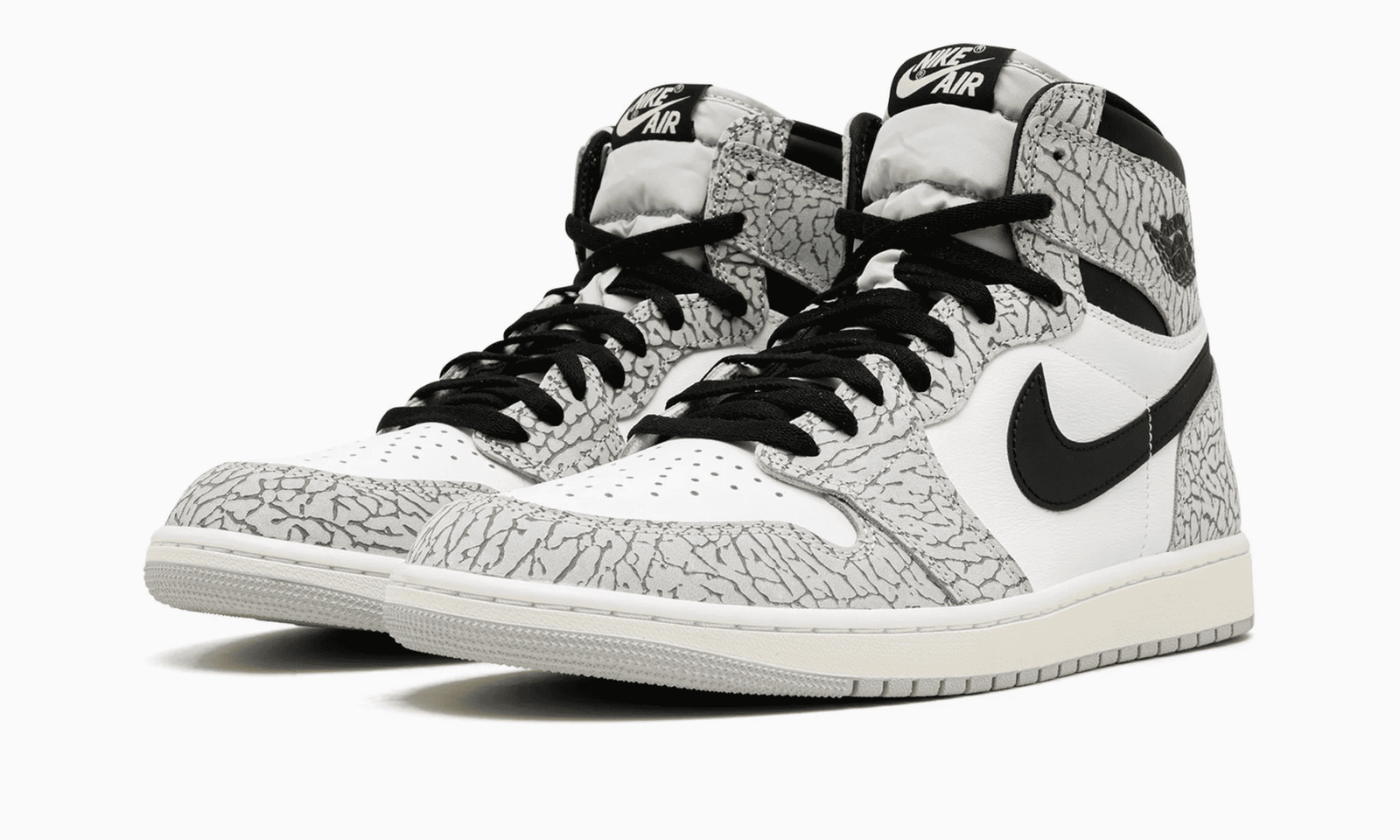 Let’s talk about that print. The Jordan 1 White Cement doesn't use the print sparingly. It’s everywhere. From the mudguard to the eyestays and the heel counter, that crackled grey-and-black pattern dominates the visual space. Underneath, you’ve got a crisp white leather base. It’s simple. It’s jarring.